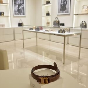 - The focal point of the accessory is the polished antique gold-finish metal C buckle, a tribute to the historic 30 Montaigne address and the brand’s timeless heritage.