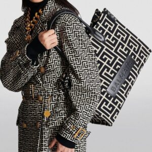 Feature Description Brand Balmain Paris Material Premium Monogram Jacquard Canvas with Leather Trim Colorway Ivory & Black Bi-color Hardware Tonal Black Logo Plaque & Gold-tone Accents Carry Style Dual Rolled Leather Top Handles Extras Detachable Matching Monogram Pouch Closure Open Top with Interior Bridge Strap Key Features Iconic Aesthetic: Showcases the signature “PB” labyrinth motif…
